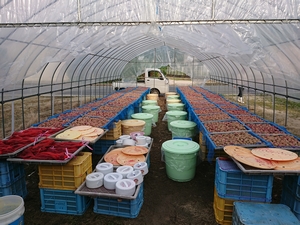 ブログ今日も雨が降ったり止んだりのうっとうし天気でしたが、天気予報によると、来週には梅雨も明けそうということでしたので、梅干しを干すための準備をしました。 ハウスにビニールを張り、梅干しを干す用のパレットが置けるようにコンテナ…