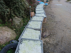 大根をコンテナ3杯分取ってきて、水洗い、皮むきをして専用の道具で平たく細くカットしました。
