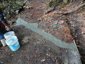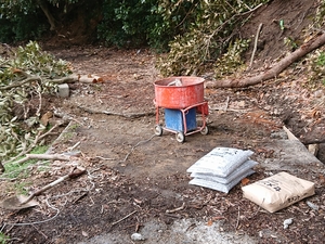 機械を使ってコンクリートを練ります。写真の赤色と青色の機械です。その向こう側をコンクリートを使って埋めます。