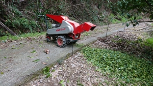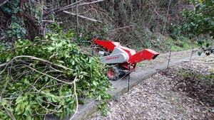 この機械は、枝なんかを粉々にしてくれる機械です。写真の中で機械の手前に写っている枝の集まりもこの機械にかけると下の写真のように粉々になってしまいます。