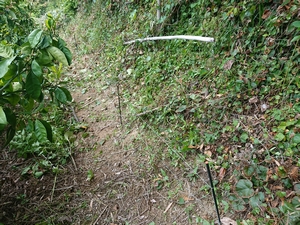 3、4月は畑に行く途中でイノシシを見ることが無かったのですが、5月に入ってからよく見かけるようになりました。特に食べられるものは無いのですが、ミカンの木の根元を掘り返したり、木を傷つけたりすることがあるので、園地に入られないように電気柵の点検を行いました。電気柵には問題無かったのですが柵周辺の雑草が伸びていたので草刈りを行いました。