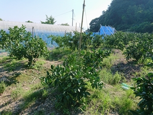 梅雨明けしてから連日のように30℃を超え、外での作業がきつくなってきました。朝早くから仕事をして、昼の暑い時間はさけまた夕方に作業するようにして対応しています。今の時期、農薬散布や、草刈り、摘果、梅干し作り等いろんな作業があります。そんな中で今日は枝吊りという作業を行いました。山から適当な竹を切ってきて、みかんの実をたくさんつけて地面についてしまいそうな枝や、折れてしまいそうな枝を吊り上げて、負荷をへらしてあげる作業です。