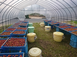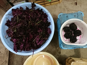 今年は5月30日から約一週間かけて南高梅の収穫を行いました。収穫した梅は一晩水に浸けた後塩漬けにします。やまもと農園では減塩を行っており通常20%程度で行う塩漬けを15%で行っています。塩漬け後5日程で梅酢が上がってきますのでその状態になったらシソを手もみして塩漬けの樽に入れます。